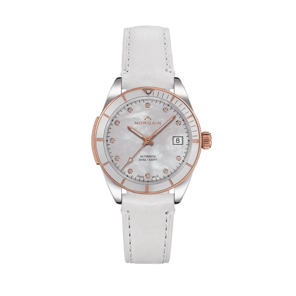 This 37mm automatic-winding Adventure Sport timepiece features a stylish mother-of-pearl dial with diamond indexes. There is a date window at 3 oclock and Superluminova covers the hands so you can read the time no matter where your adventures take you. The stainless steel watch has a 5N red gold bezel complete with a sporty ceramic ring. This white and gold NORQAIN Adventure Sport Lady is fitted with a white rubber strap. Powering this robust wristwatch is the NORQAIN caliber NN09, which is visible through the sapphire glass caseback.