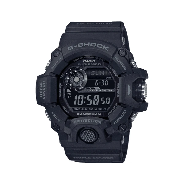 Major features of the Rangeman GW-9400-1B include mud resistance, low temperature resistance (-10C/14F), Tough Solar power, Multi-Band 6 auto radio timekeeping, Triple Sensor, sunrise/sunset data, one-press stopwatch start button, and 40-set sensor record memory, shock-resistant and water-resistant to 200 meters.