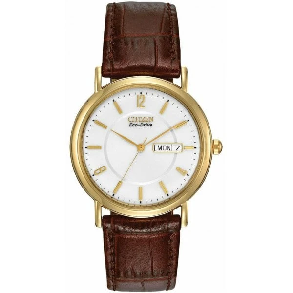 Timeless appeal abounds with this simple, stainless steel watch from Citizen with a 36mm case and brown leather strap. The white dial, along and day-date indicator, lend an air of practicality to this 3-hand model. Features our Eco-Drive technology – powered by light, any light. Never needs a battery.