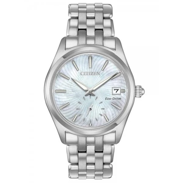 The Citizen ladies’ Silhouette offers a feminine and contemporary timepiece, perfect for any occasion. Featured in a stainless steel case and bracelet with pretty Mother-of-Pearl dial and date function. Featuring Eco-Drive technology – powered by light, any light. Never needs a battery.