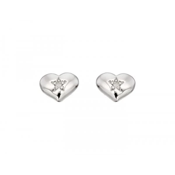 Little silver heart-shaped children’s earrings featuring Cosmo’s engraved star, set with a sparkling diamond.