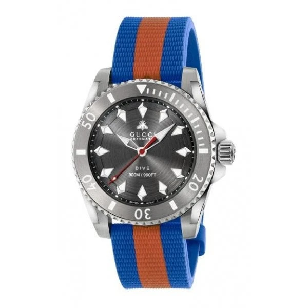 40 mm steel case, dark grey dial with bee, steel bezel, rubber strap
