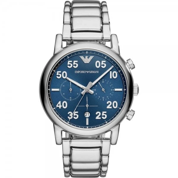 This aviator-inspired men’s Emporio Armani watch is stylishly equipped with a polished steel case, blue sunray chronograph dial and a brushed-and-polished steel three-link bracelet.