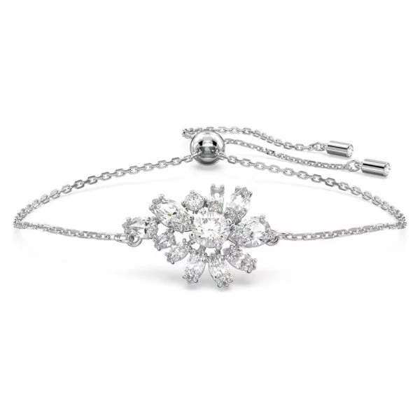 Complement any outfit with this delicate flower bracelet from the Gema family. Shimmering with a mix of clear stones in refined prong settings, it has a rhodium plated chain and adjustable closure for the perfect fit. Wear it solo or stacked with other pieces from this captivating collection.