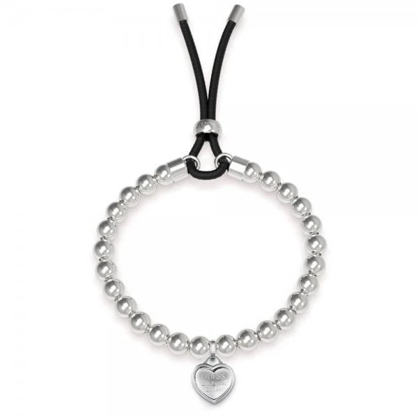 This stunning bracelet will make the perfect gift for a special friend. Crafted in stainless steel, the bracelet features a beaded design with a black thread toggle fastening. The bracelet is also adorned with a heart shaped pendant that is engraved with Guess logo details.