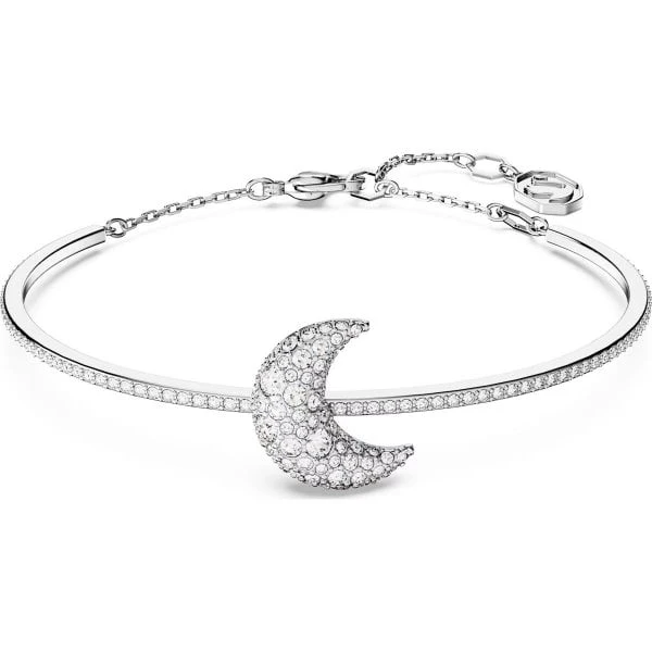 Wear the magic of the night sky on your wrist. This rhodium plated bangle features a crystallized bangle with a central crescent moon motif, beautifully embellished in five different sizes of crystals for a refined pavé effect. The design is completed with a lobster closure and is a perfect moongazing choice to make your style shine.