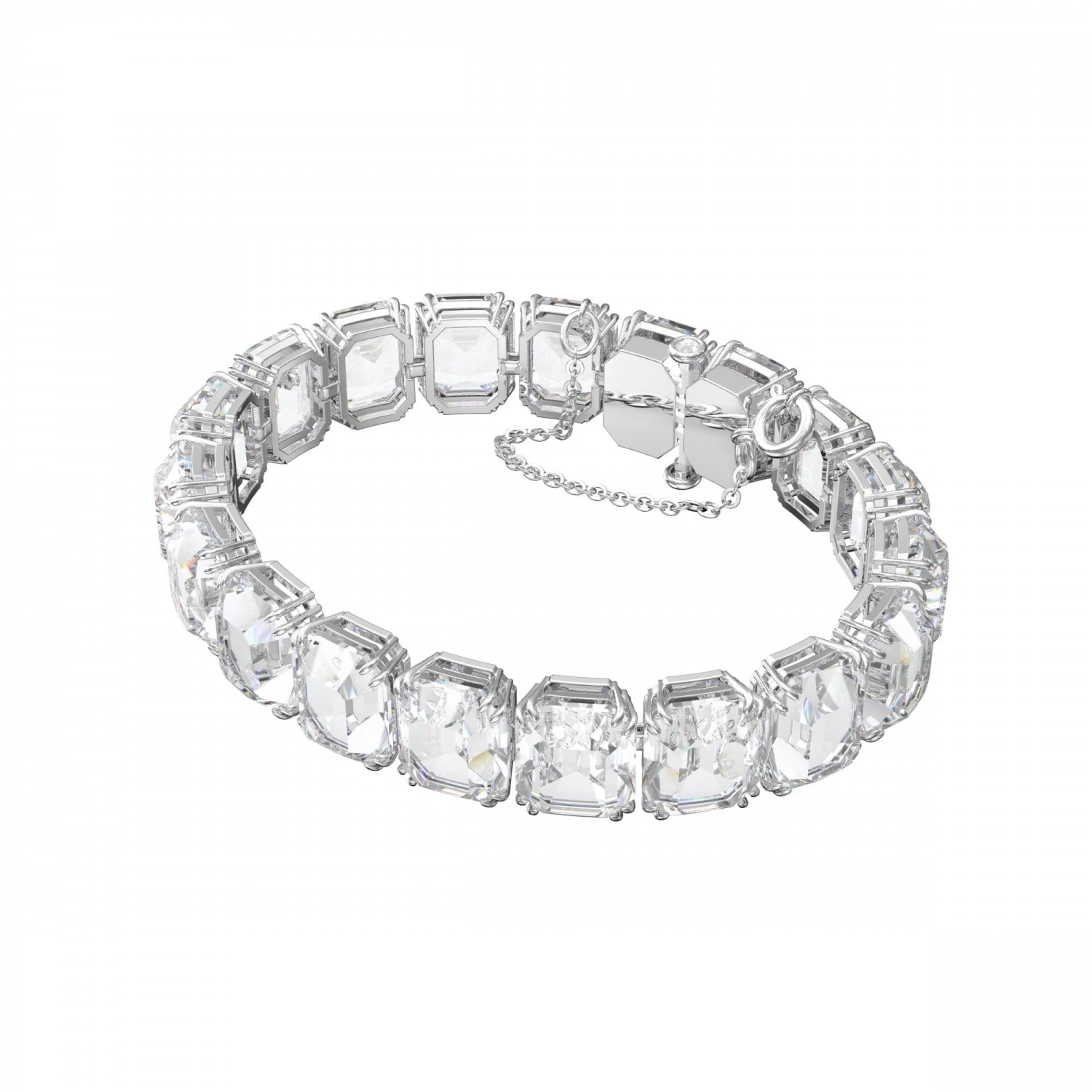 Meet your new everyday bracelet. A contemporary spin on fine jewellery, it’s crafted from a single row of octagon, step-cut crystals cradled in sleek, rhodium-plated prong settings. Designed to be worn and loved forever it will become as fundamental to your wardrobe as your go-to pair of jeans. This bracelet is part of the Millenia family, designed by Creative Director Giovanna Engelbert for Collection II. How to close and open it: slide the hooks into the corresponding holes at the base of the end stone and push to click into place. Fasten the security chain using the small lever clasp. To open, unfasten the security chain and press the buttons on either side of the stone at the same time to release the hooks.