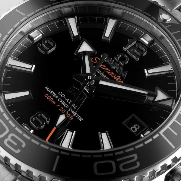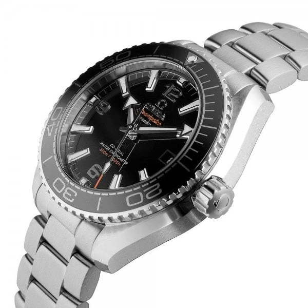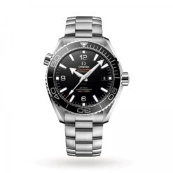 This model, with its scratch-resistant sapphire crystal, features a black ceramic dial with Arabic numerals and a date window at the 3 oclock position. The black ceramic unidirectional bezel with OMEGA Liquidmetal diving scale is mounted on a 43.5 mm stainless steel case.