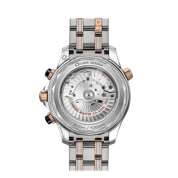 The watch is presented on a stainless steel and 18K Sedna™ gold bracelet and is driven by the OMEGA Master Chronometer Calibre 9900, which can be seen through the sapphire-crystal on the wave-edged caseback.