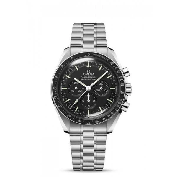 Presented on a brushed five-arched-links-per-row bracelet, this 42 mm Moonwatch in stainless steel features hesalite glass on the front and an embossed Seahorse medallion on the caseback. Inspired by the 4th generation Speedmaster style worn on the moon, it also includes an asymmetrical case, black step dial and the famous dot over 90 on the anodised aluminium bezel ring.