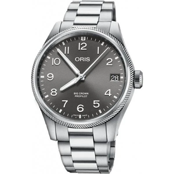 Firstly, the brushed stainless steel case is 41mm in diameter and has a distinctive fluted edge to the bezel. Secondly, the dial is in anthracite grey. It also has bold, arabic figures and hour markers in white. Along with the hands, these are coated in superluminova for legibility in poor light. Additionally, a minute track ensures the dial is easy to read. The date is displayed at 3 oclock. Finally, the sapphire crystal is domed on both sides. An anti-reflective coating on the inside reduces glare for better legibility in the cockpit.