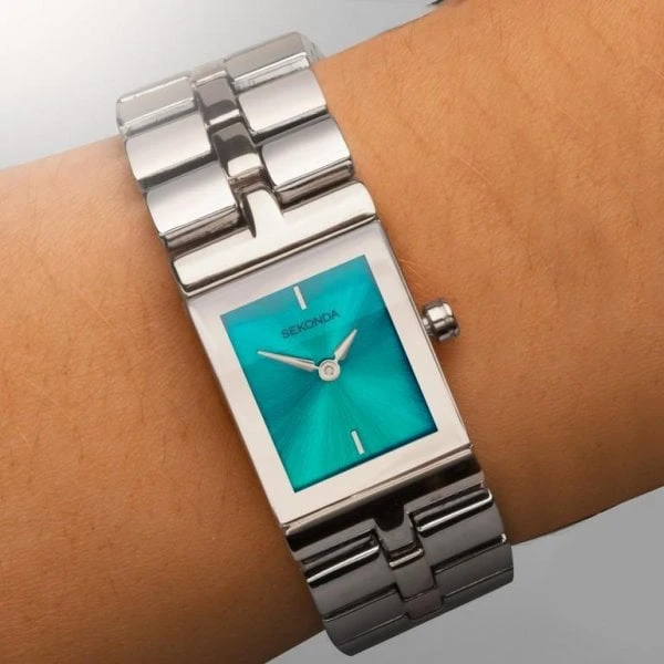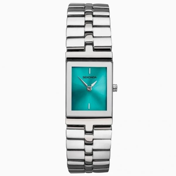 This watch features a square, silver coloured case housing an aqua sunray dial. Fastened with a silver coloured alloy bracelet.