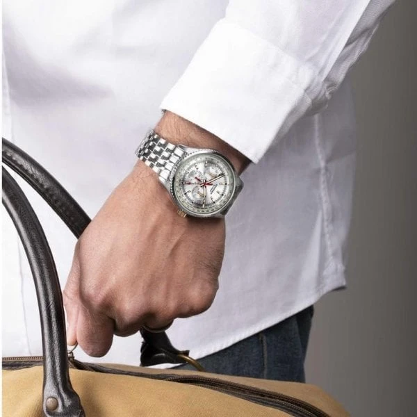 This watch has a round, silver ion-plated alloy case with a white chapter ring and a silver dial. Fastened with a stainless steel bracelet, features include 24 hour read out, a day/date display and up to 50 metres water resistance.