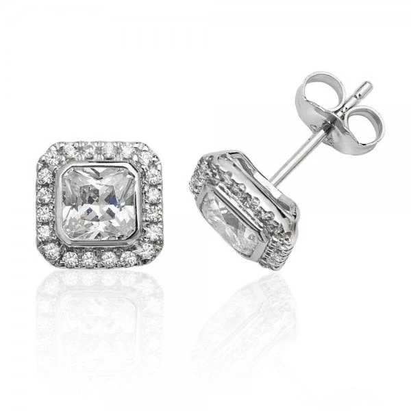 Silver Bezel Set Halo Style CZ Stud Earrings