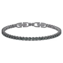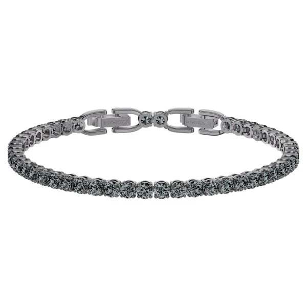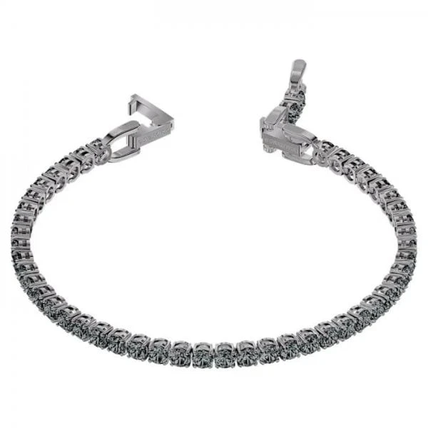 Full of subtle sparkle and contemporary edge, this classic ruthenium plated Tennis Bracelet can be dressed up or down. It features a delicate strand of prong-set round crystals in a dark grey colour. An elegant and minimalistic must-have for everyday wear.