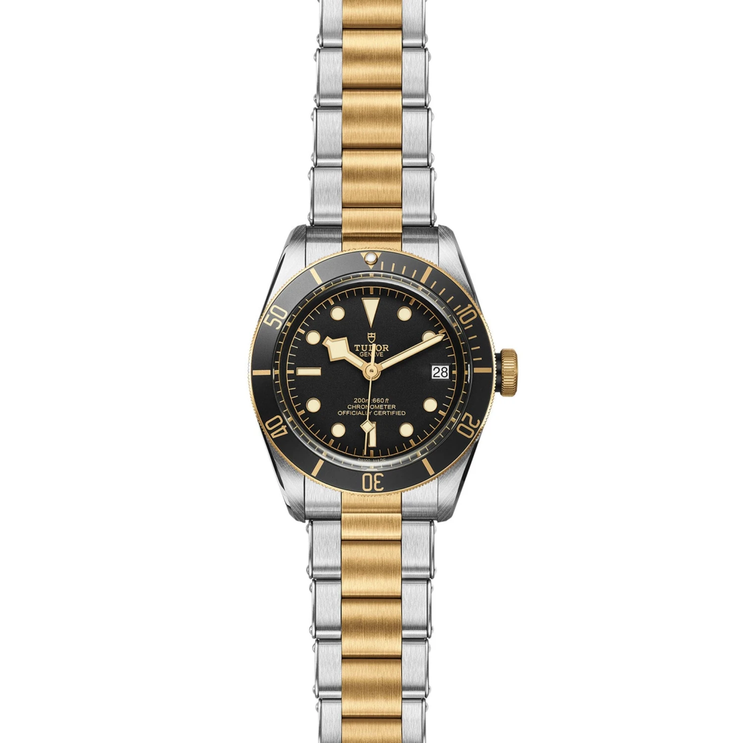 CROWN:Yellow gold screw-down winding crown, with the TUDOR rose engraved and lacquered in black, with black anodised aluminium winding crown tube